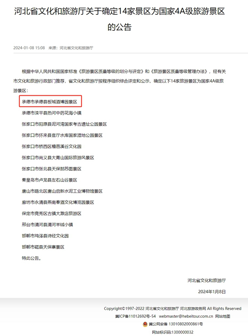 根據(jù)中華人民共和國國家標(biāo)準(zhǔn)《旅游景區(qū)質(zhì)量等級(jí)的劃分與評(píng)定》和《旅游景區(qū)質(zhì)量等級(jí)管理辦法》,經(jīng)有關(guān)市文化和旅游行政部門推薦,省文化和旅游廳按程序組織綜合評(píng)定,承德市承德縣板城酒博園景區(qū)被評(píng)選為國家4A級(jí)旅游景區(qū)。