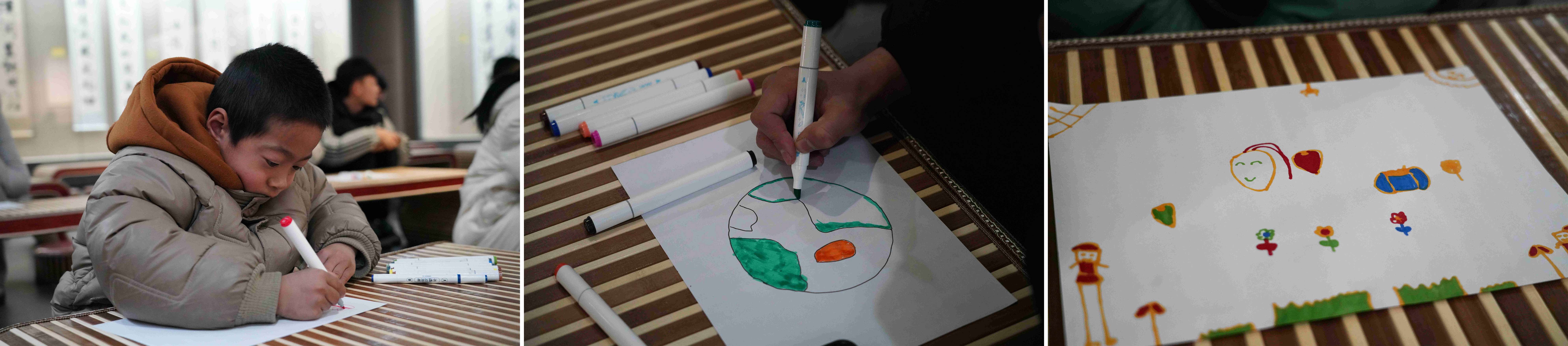 兒童組“我的快樂星球”藝術(shù)創(chuàng)作:在一個布置著字畫與小桌椅的溫馨展廳里,孩子們在專業(yè)引導(dǎo)下,拿起畫筆,通過色彩與線條自由表達情緒,描繪出各自獨一無二的“快樂星球”。童真的畫作,成為他們內(nèi)心世界的生動寫照。